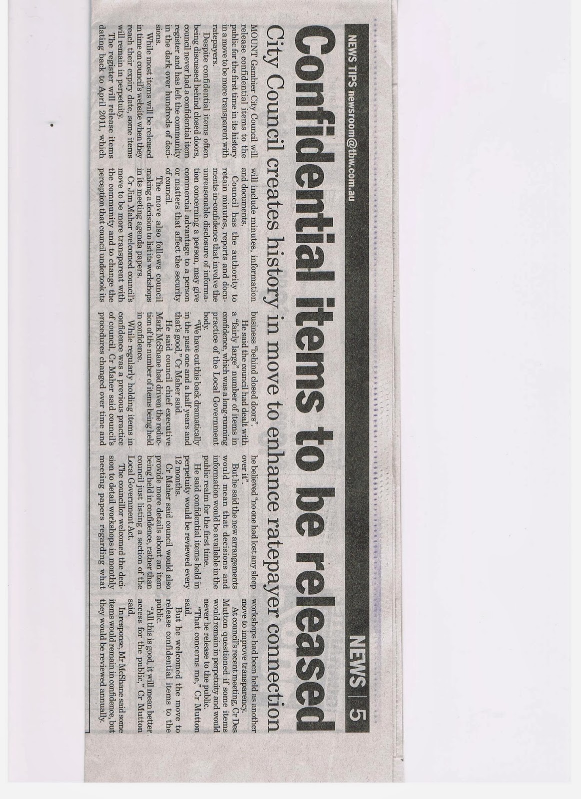 Clear As Mud: could be the alternative title for this post, or even 'Look, Nothing To See Here'...either would accurately describe City Council's latest attempt to fake Public Consultation and/or Transparency as reported in The Border Watch Tuesday 31st December 2013, 'Confidential items to be released' (attached below, sorry about orientation).